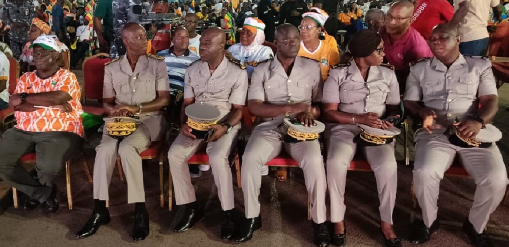 Toute l’administration territoriale du département conduite par le Préfet de département, Préfet de Région Légré Koukougnon (à gauche du maitre ) a suivi avec attention la prestation des Eléphants à la place Elleingand Etchè.