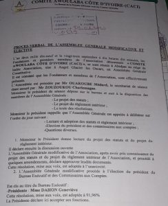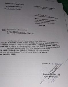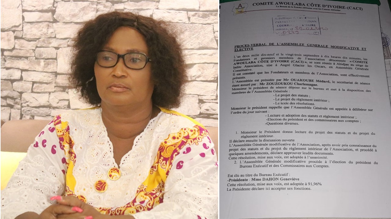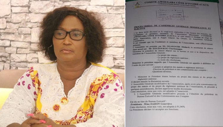 s’est auto-proclamé Président du Comité Awoulaba Côte d’Ivoire, dont je suis la présidente statutaire, au risque de me répéter, et se répand dans des diatribes usurpatoires et diffamatoires à l’encontre du CORA et de ma personne » s’est-elle indignée et d’ajouter, « il avait dit par exemple à mon vice-président ici présent le Commissaire Waka et je cite : « Waka fait on va dégager Géneviève pour prendre le concours là »Il a osé organiser un point de presse il y a presque 2 semaines pour annoncer la tenue du concours Awoulaba en Côte d’ivoire sous sa direction ; sans avoir dit que j’avais été déchu de mon poste pour faute lourde », a-t-elle dénoncée.