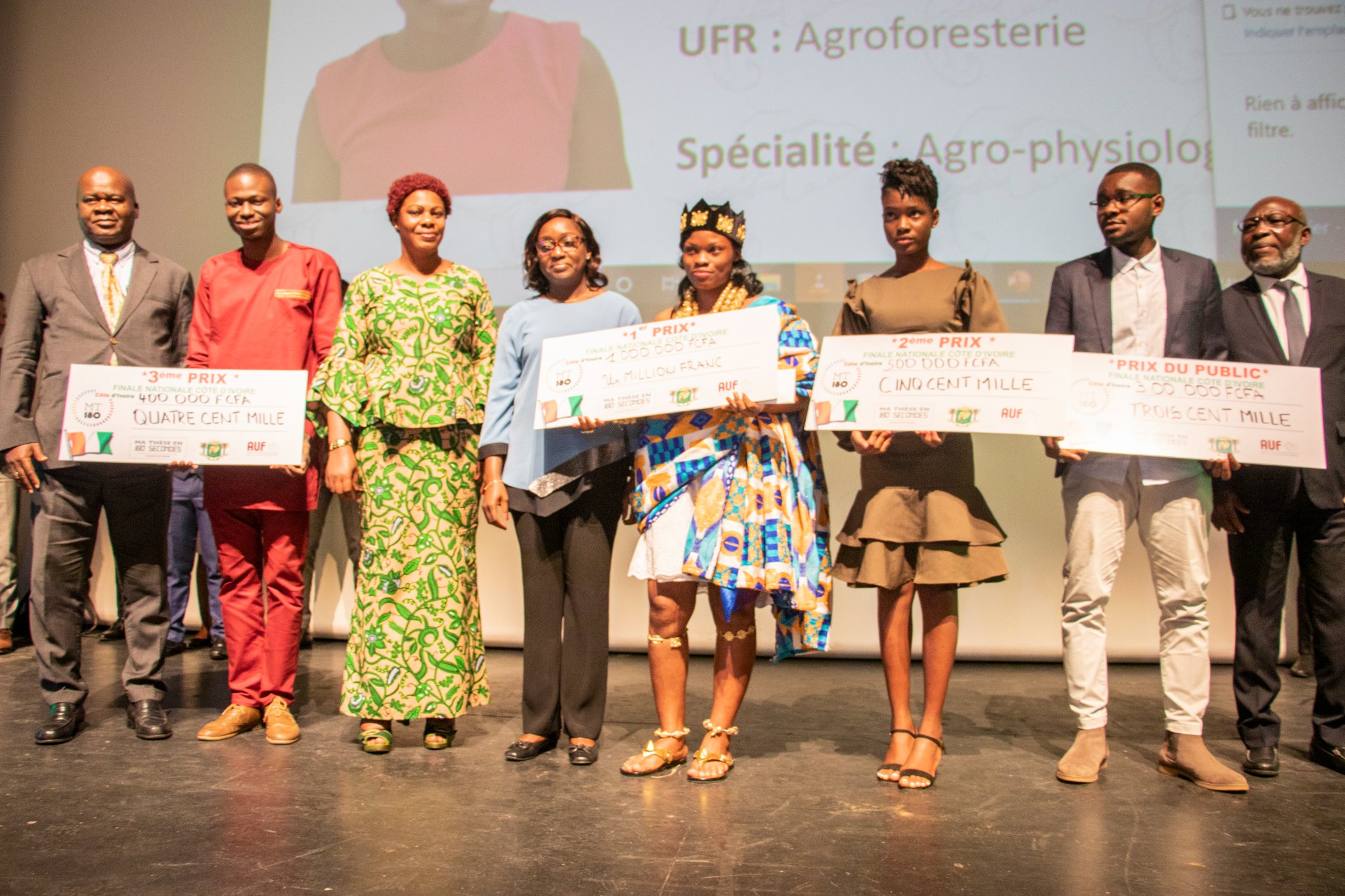 Le jeudi 23 juin 2022 a eu lieu la finale de Ma thèse en 180 secondes (MT180) organisée par l’Agence universitaire de la francophonie (Auf) à l’institut français d’Abidjan Plateau en présence de Mme N’da cheffe de cabinet représentant la première dame de la Côte d’Ivoire Mme Dominique Ouattara et de Professeur Ouattara Fatou épse Soro représentant le ministre de l’Enseignement supérieur et de la Recherche scientifique, le Pr. Adama Diawara et de M Logbon Serge, représentant Mme le ministre de la Culture et de la Francophonie, Mme Françoise Remarck.