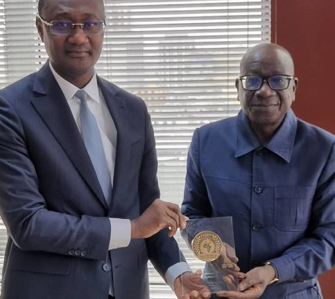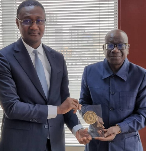 Lauréat du prix du Meilleur Manager Africain du secteur des régies financières, le Directeur général des Impôts, Ouattara Sié Abou a présenté son trophée au Ministre du Budget et du Portefeuille de l’Etat Moussa Sanogo.