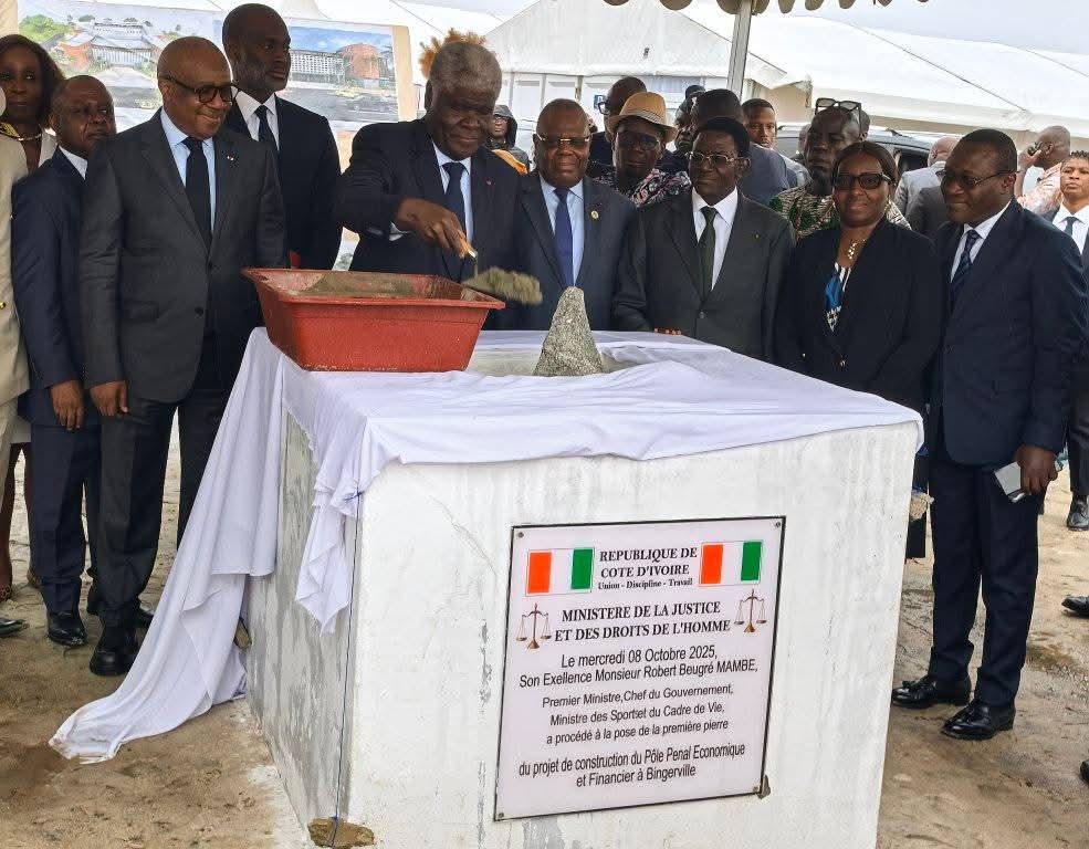 Le gouvernement ivoirien vient franchir une nouvelle étape ce 08 OCTOBRE 2025 à Bingerville dans le renforcement du système judiciaire avec la pose de la première pierre du futur siège du Pôle Pénal Économique et Financier (PPEF). La cérémonie, présidée par le Premier ministre Robert Beugré Mambé, s’est tenue ce mercredi à Bingerville, en présence du Garde des Sceaux, ministre de la Justice et des Droits de l’Homme, Jean Sansan Kambilé, et de plusieurs personnalités du monde judiciaire.