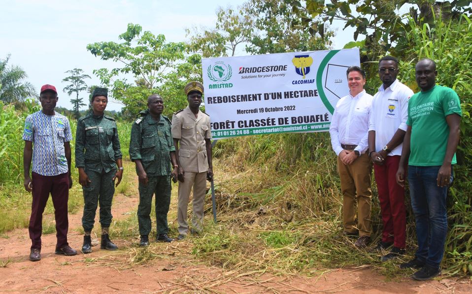 A leurs côtés, l’ONG AMISTAD « Actions pour la Mobilisation des Initiatives et Stratégies d’Aide au Développement », une ONG elle aussi engagée dans la protection de l’environnement et spécialisée dans le reboisement et l’agroforesterie, a piloté techniquement cette opération de reboisement. « Nous avons choisi la forêt classée de Bouaflé pour encourager les initiatives de reconstitution du couvert forestier avec nos partenaires BRIDGESTONE et CACOMIAF. La politique du gouvernement ivoirien consiste à encourager la reforestation. Nous sommes satisfaits que le secteur privé s’engage concrètement. », a rapporté Brice Delagneau, Président de l’ONG AMISTAD.
