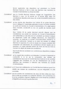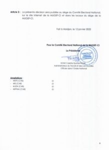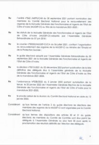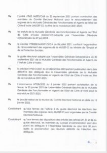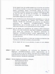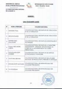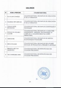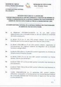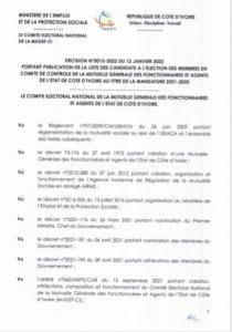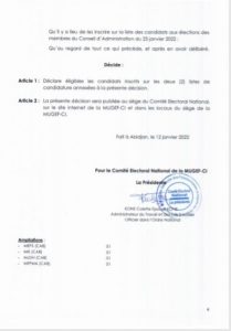 Le Comité Electoral National présidé par Mme Koné Colette vient de prendre deux importantes décisions portant publication de la liste des candidats à l’élection des membres du Conseil d’Administration et de la liste des candidats à l’élection des membres du Comité de Contrôle au titre de la mandature 2021-2025.
