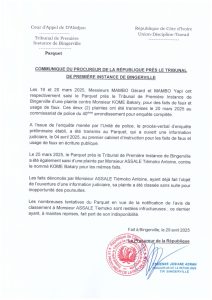 Bingerville, 29 avril 2025 – Le Parquet près le Tribunal de Première Instance de Bingerville a annoncé, ce mardi, l’ouverture d’une information judiciaire contre Monsieur KOME Bakary pour des faits présumés de faux et usage de faux en écriture publique. Cette procédure fait suite à plusieurs plaintes déposées entre les 19 et 25 mars 2025.