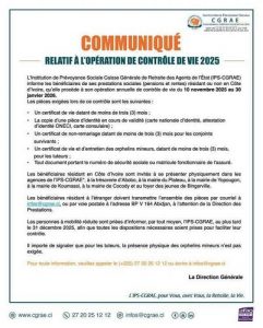 Les pensionnés résidant en Côte d’Ivoire sont invités à se présenter physiquement dans les agences de l’IPS-CGRAE, ainsi qu’aux points de contrôle installés à la trésorerie d’Abobo, à la mairie du Plateau, à la mairie de Yopougon, à la mairie de Koumassi, à la mairie de Cocody, et au foyer des jeunes de Bingerville.