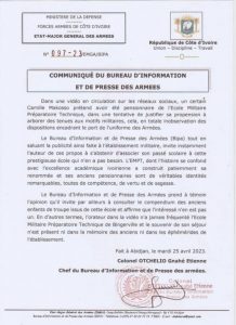 L’influenceur Général Makosso vient d’être remis à l’ordre par le bureau des informations et de la presse des armées (Bipa) suite à une sortie légère rappelant qu’il a été un enfant de troupes de l’Ecole militaire préparatoire technique de Bingerville (Empt). Voici la mise en garde adressée à l’intéressé.