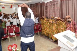 Séance d’étirement et d’exercices respiratoires lors de la cérémonie officielle